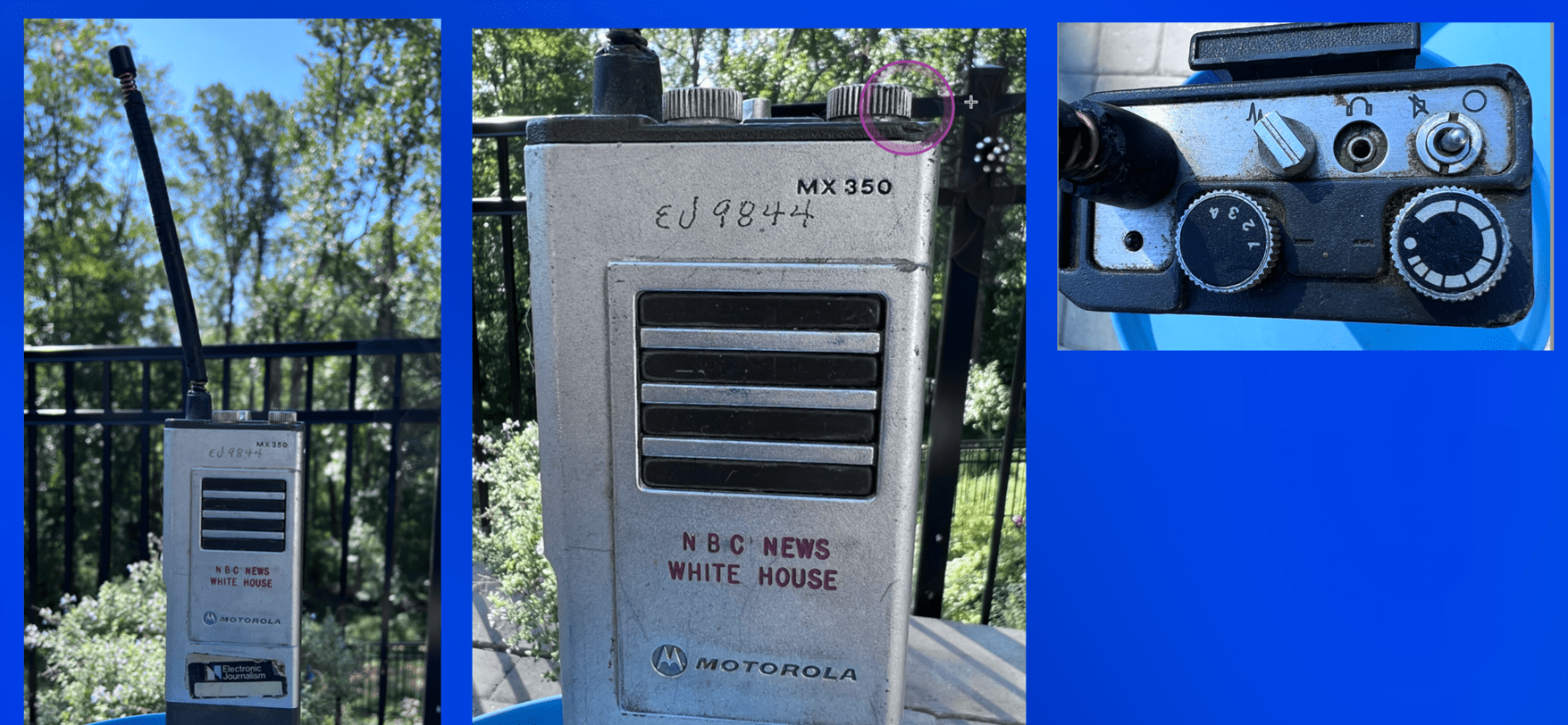 This GEM was sitting in a pile of electronic junk boxes in the Field Operations equipment room at NBC in Washington DC. My recollection is that it was soon to be jettisoned in one of the every year or two, “get rid of excess crap” projects. I was lucky enough to “save” one! Ha. Pre-Cell Phone era, these were our primary means of communications with Tech Opns and Editorial. No encryption. VHF and UHF voice only. 2.5 watts. Motorola Built and tough. Real metal. Leather cases that today would cost several hundred dollars. I’ve still got it.
